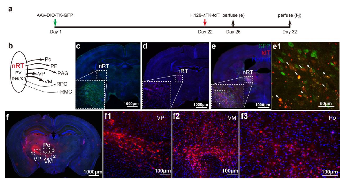 实验方法和结果:在PV-cre小鼠nRT脑区先注射cre依赖的TK辅助病毒,3周后注射H129-ΔTK-tdT,然后一些小鼠在第25 天灌流取材,确定跨突触的起始细胞;剩下的小鼠在第32 天取材,可以在多个脑区检测到信号,这些脑区包括VP,Po,VM等。
