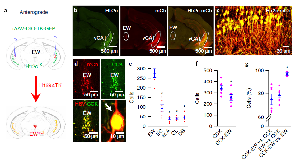 图2. vCA1脑区Htr2c神经元直接支配EW区神经元(Xinyan,et al, Nature Neuroscience,2018)