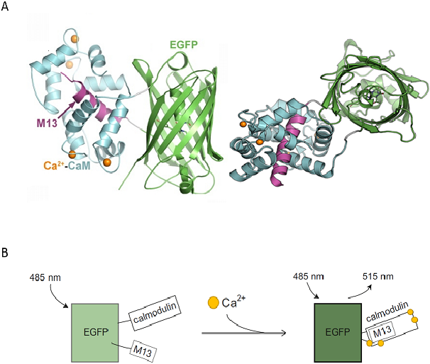 2.基因编码钙离子指示剂:这些指示剂是来自于绿色荧光蛋白(GFP)及其变异体(例如循环排列GFP,YFP,CFP)的荧光蛋白质,与钙调蛋白(CaM)和肌球蛋白轻链激酶M13域融合。现在使用较广泛的基因编码钙离子指示剂有:GCaMP、Pericams、Cameleons、TN-XXL和Twitch,其中GCaMP6由于它有着超强的敏感度,现在被广泛应用于活体钙成像研究。