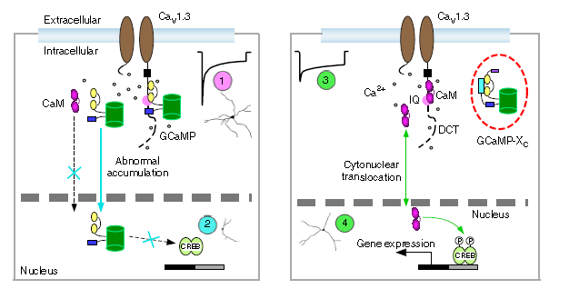 钙调素(Calmodulin,CaM)严重干扰了L型电压门控钙通道介导的兴奋-转录耦联,使得神经元的钙动态以及基因表达均出现异常。在探针中引入特异性apoCaM保护元件以克服“非钙结合态钙调素”(apoCaM)的干扰。