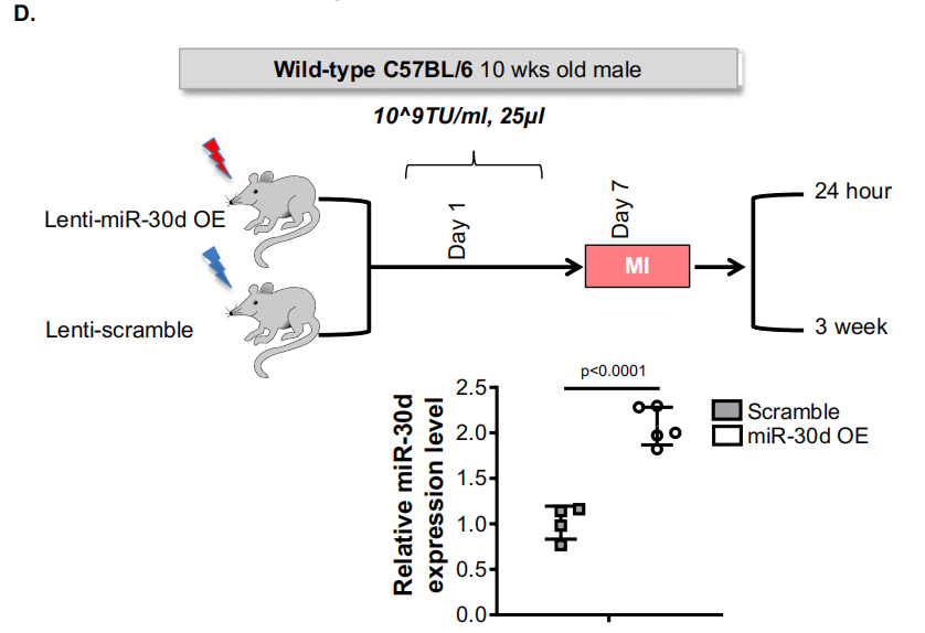在MI(心肌梗死)手术前1周的开胸手术中单点心肌注射25μL过表达miR-30d慢病毒,结果显示术后三周心脏中miR-30d水平增加2倍。