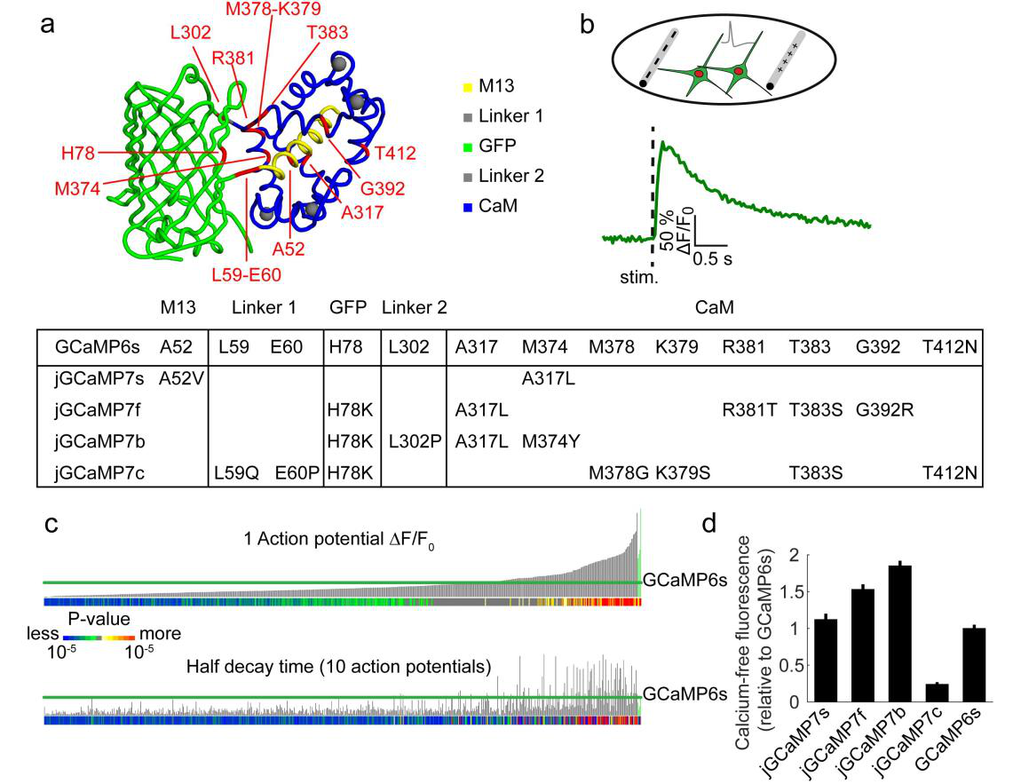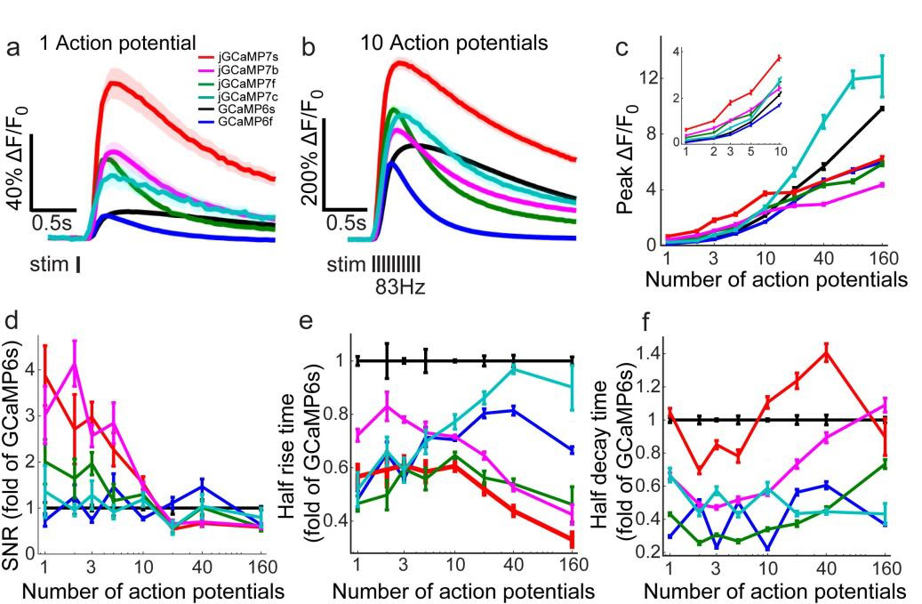 研究人员利用在存在或不存在Ca2+时GCaMP的晶体结构,确定了可能影响指示剂关键性质的位置,包括静息荧光和峰值荧光,以及结合和不结合Ca2+的亲和力和动力学。GCaMP包括一个与钙调蛋白(CaM)融合的环状排列GFP(cpGFP)和一个来自肌球蛋白轻链激酶(Rs20,也称为M13)的钙调蛋白结合肽。钙调蛋白依赖的构象变化及其与M13和GFP的相互作用调节GFP发色团环境并影响荧光。对GFP-CaM接口和CaM-M13相互作用接口进行了定点突变(图1a)。通过电极刺激培养的神经元筛选662个变异的jGCaMP7(图1c),继续在体外特性研究中得到了性能优良的jGCaMP7s、jGCaMP7f、jGCaMP7b和jGCaMP7c。其中,jGCaMP7s灵敏性可达GCaMP6s的5倍以上,且速率也快于GCaMP6s;jGCaMP7b灵敏度达到GCaMP6s3倍,荧光亮度增强50%;jGCaMP7c灵敏度是GCaMP6s的2.7倍,且对比度增强;jGCaMP7f反应速率是GCaMP6f的5倍及GCaMP6s的3倍(图2)。