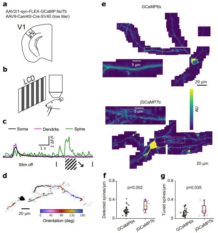 研究人员随后在在体水平验证了jGCaMP7。在检测jGCaMP7在成年果蝇椭球体神经元的表现中,检测对于闭环视觉刺激下的运动果蝇的树突神经活动,通过双光子成像发现jGCaMP7f相比GCaMP6f表现出更高的检测灵敏度(图3)。通过对小鼠初级视觉皮层双光子成像中,发现jGCaMP7b相比于GCaMP6s能够在更多的树突棘中检测到对视觉刺激的反应(图4)。