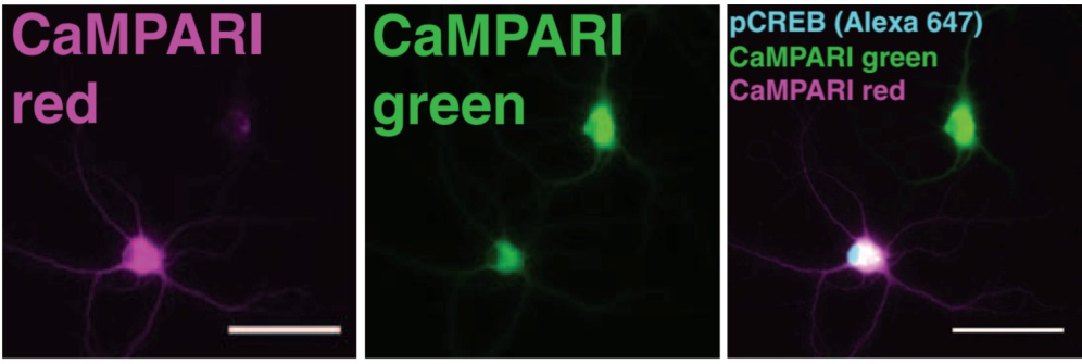 传统的钙成像技术受限于显微镜的视野,只能对很小的一片区域进行记录。随着神经科学的进步,人们认识到大脑运作需要借助许多不同脑区的相互协作,要对这些过程进行研究,需要对整个大脑的神经活动进行细致的观测,而传统的钙成像技术在这一方面毫无办法。另外,由于传统钙成像实验要求成像的光路极为稳定,因此科学家需要把实验动物的脑袋固定起来以方便成像实验。脑袋被固定的实验动物,大脑活动与自由状态下势必存在差别,对科研家而言,这样获得的数据可能还是不够准确。正因如此,神经科学迫切需要一种能够兼顾全局和微观的新型钙成像技术,这就是2015年2月份科学家在著名杂志Science上发表的文章所要解决的问题,他们介绍了一种全新的蛋白CaMPARI(calcium-modulated photoactivatable ratiometric integrator)。