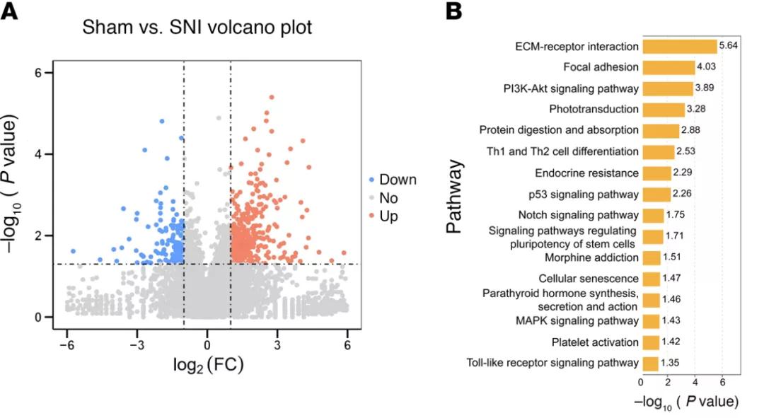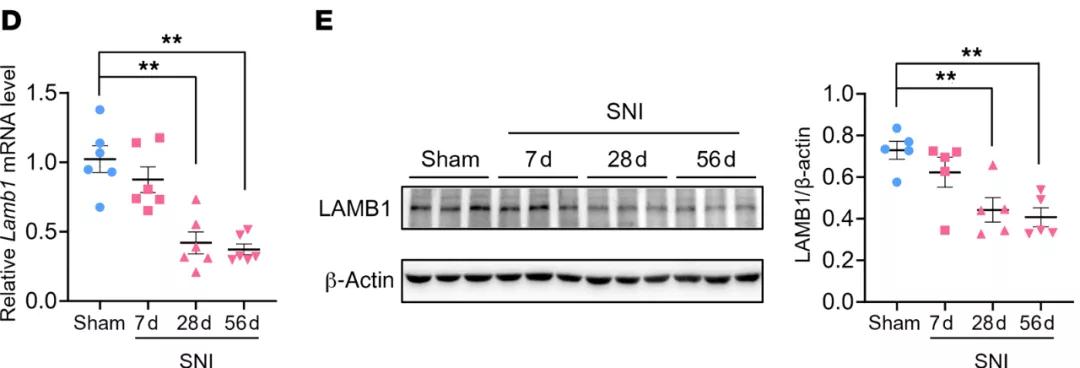 这篇文章中,作者首先利用选择性神经损伤(Spared nerve injury,SNI)建立小鼠神经病理性疼痛模型,在伴发焦虑抑郁样行为后,取其ACC脑区进行了转录组测序分析。发现细胞外基质(Extracellular matrix,ECM)受体相互作用和黏着斑相关通路差异基因富集的显著程度最高。在ECM相关通路的基因转录水平中,层粘连蛋白β1(Laminin β1,LAMB1)作为一种ECM参与了细胞多种生理和病理进程,在SNI模型中出现了显著下调。并通过转录和蛋白水平检测进一步验证转录组测序结果。以上结果提示,ACC脑区中LAMB1表达下调可能参与了SNI诱致的慢性痛伴发焦虑及抑郁等精神障碍共病的发生。