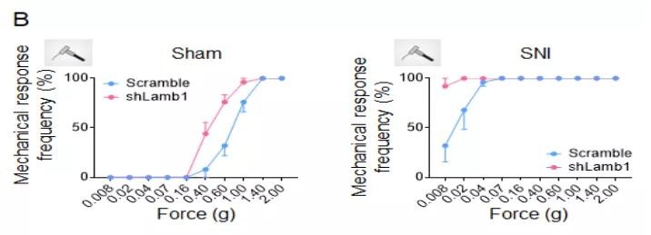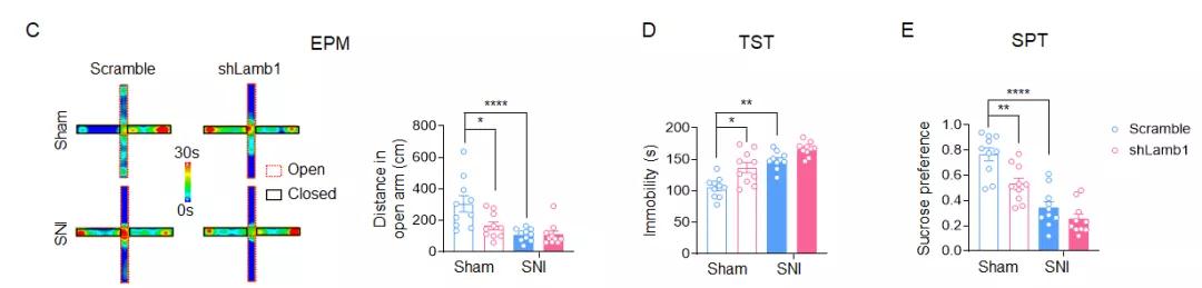 由于LAMB1可能参与ACC脑区调控慢性痛及伴发负性情绪的作用,作者构建了LAMB1干扰病毒,通过外源阻断其在ACC中的表达,观察对小鼠疼痛阈值及焦虑抑郁样行为的影响。结果发现,LAMB1干扰使小鼠同侧足底机械刺激反应曲线出现明显的左移和上移,且痛觉阈值显著降低,对Sham组和SNI组均有影响。通过高架十字迷宫实验发现,LAMB1抑制后,在小鼠活动总距离没有改变的情况下,Sham组小鼠在开臂中的活动距离明显降低;同时,悬尾和糖水偏好实验也得到了相似的结果,LAMB1干扰增加了Sham组小鼠不动时间,降低了小鼠糖水摄入量。以上结果提示,ACC脑区中LAMB1表达下调,能够加剧并恶化小鼠机械性痛觉反应,并显著诱发小鼠出现焦虑及抑郁样行为。