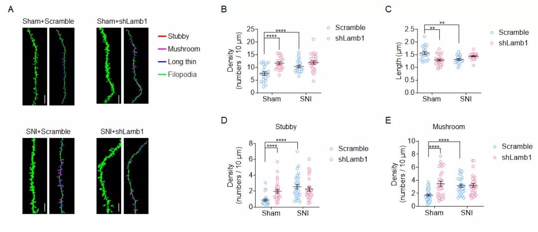 由于ACC脑区锥体神经元突触可塑性改变被认为是介导神经病理性疼痛和精神障碍共病的重要神经机制之一,同时作为ECM分子的LAMB1与神经突触稳定和可塑性有关,因此,作者通过干扰LAMB1观察ACC脑区锥体神经元结构和功能是否发生改变。高尔基染色显示,敲除LAMB1后,ACC锥体神经元顶树突棘密度增加,长度降低。对不同类型树突刺的进一步分析表明,干扰LAMB1与SNI均使Stubby和Mushroom成熟型突触显著增多。以上结果提示,LAMB1表达对维持ACC脑区锥体神经元顶树突突触结构稳定性发挥着重要作用,表达下调可能导致突触结构重塑。