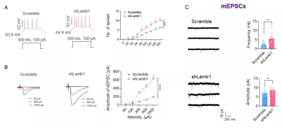 外周神经损伤导致的痛觉敏化以及负性情绪会引起中枢神经敏化现象,其中,ACC脑区锥体神经元就会表现出超兴奋现象。因此观察LAMB1对ACC锥体神经元兴奋性是否产生影响。作者利用全细胞膜片钳记录技术评估了LAMB1缺失对扣带回突触传递的功能后果。结果发现,敲低ACC中的LAMB1会增加神经元的兴奋性,并增强锥体神经元的突触传递。同时,ACC中LAMB1缺失后,mEPSCs的频率和振幅均增加。这表明LAMB1的缺失通过突触前和突触后两种机制增强了突触的传递。