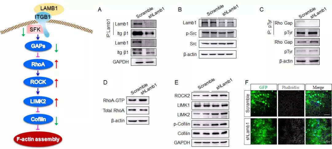 通过免疫沉淀反应试验和免疫印迹分析,发现ACC脑区中LAMB1缺失导致的突触重塑可能是由于Src依赖的RhoA/ROCK/LIMK信号级联激活引起的,从而导致活性cofilin水平异常下降,最终导致肌动蛋白结构重排。