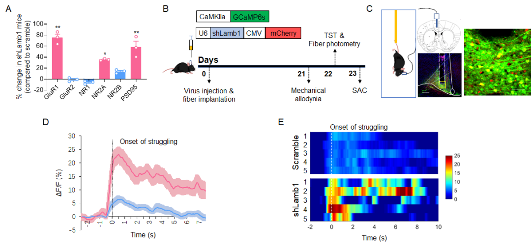 考虑到肌动蛋白稳定性对AMPAR膜转运的重要性,作者进一步发现在敲除LAMB1后AMPAR和NMDARs的膜转运增强。观察AMPARs上膜是否影响体内功能,通过对小鼠进行单侧病毒注射同时埋入光纤,带有CaMKⅡ启动子的GCaMP6s表达的绿色荧光病毒分别与带有红色荧光Scramble对照病毒和带有红色荧光shLamb1病毒进行共标,在小鼠注射病毒21 d后,ACC脑区表达shLamb1,小鼠出现了痛觉敏化和悬尾实验中不动时间延长现象。在悬尾实验过程中,利用光纤记录系统记录并分析小鼠在悬尾实验挣扎瞬间的钙信号反应。结果显示,在LAMB1干预后,小鼠在挣扎时表现为较大的钙信号瞬时变化。这一数据表 明,在ACC脑区敲除LAMB1的小鼠中,小鼠出现的痛觉敏化和抑郁样行为可能与ACC神经元活动的异常增加有关。