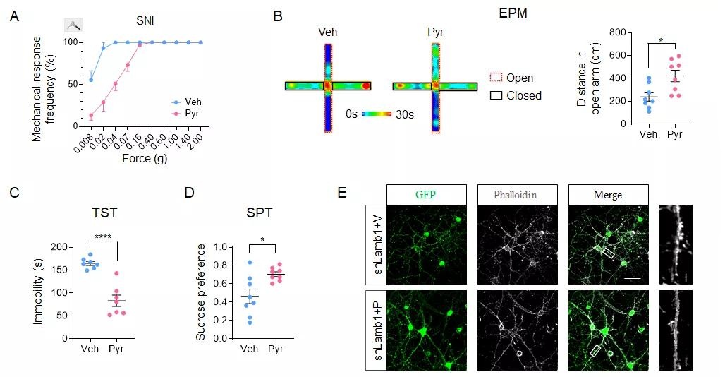 最后,作者进一步探究LAMB1是否对神经病理性疼痛和焦虑抑郁样共病行为具有治疗作用。由于LAMB1基因片段太大而无法包装于AAV、LV等病毒中实现外源过表达,因此转向寻求其结合受体Integrin β1的特异激动剂-Pyrintegrin。对SNI模型诱致慢性痛及伴发负性情绪的小鼠ACC脑区给药后,能够显著缓解机械痛觉过敏。同时,在高架十字迷宫实验中,在不影响小鼠活动总距离的情况下,Pyrintegrin显著增加了小鼠在开臂的探索时间和活动距离。悬尾和糖水偏好实验也得到了相似的结果,SNI小鼠给予Pyrintegrin后显著降低了悬尾的不动时间和增加了对糖水的摄入量。以上结果提示,激活LAMB1的结合受体Integrin β1可显著缓解疼痛,并起到抗焦虑和抗抑郁样行为的作用。