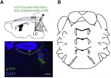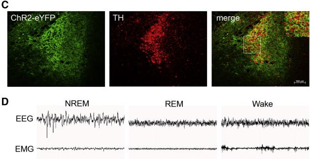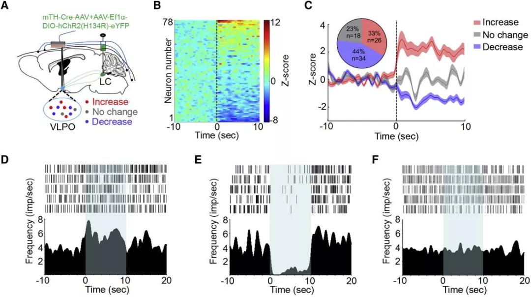 图3. LC-NA神经元抑制VLPO脑区的睡眠活跃神经元,激活觉醒活跃神经元促进觉醒