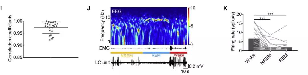 早期研究表明,LC脑区神经元相比于睡眠时期在觉醒时期放电明显增加,而LC是NA能神经元聚集分布的脑区,为了验证这种放电状态的改变是否有NA能神经元的参与,在C57BL/6N小鼠的LC脑区注射TH特异性启动子装载Cre重组酶病毒与Cre依赖编码ChR2的腺相关病毒混合注射于单侧LC脑区,并在注射位点埋植光电极,皮层埋植脑电、肌电(图1 A, B)。在不同睡眠状态下脑电(EEG)波和肌电(EMG)波的特征分别为觉醒(wake)时EEG是高频低幅,EMG有较强的放电;NREM(非眼球快速运动)睡眠时EEG是低频高幅,EMG比较安静;REM睡眠时EEG和觉醒时相似都是高频低幅,但EMG和NREM睡眠时一致是很安静的状态(图1D)。经统计发现LC的大部分NA能神经元在觉醒时有更高的放电频率相比于睡眠时期(P < 0.001),而在NREM睡眠和REM睡眠之间的平均放电频率没有统计学差异(图1J, K)。