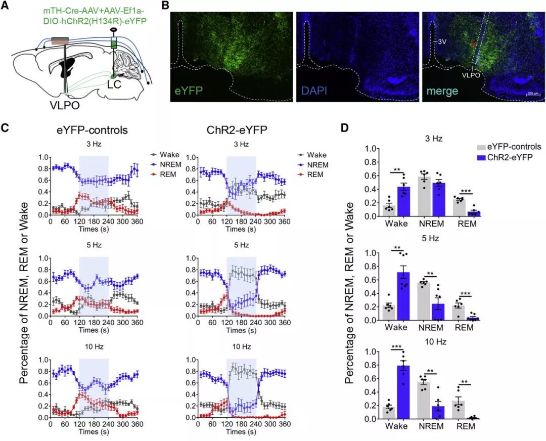 为了确定LC-VLPO的NAergic通路对觉醒调控的作用,在自由活动的小鼠上通过光遗传学操控特异性激活VLPO脑区内来自LC的NAergic投射纤维,并同时记录EEG和EMG。将具有Cre依赖的AAV载体EF1α-DIO-hChR2-eYFP与TH-Cre-AAV病毒混合注射至单侧LC脑区中,并在同侧VLPO脑区植入光电极或光纤(图2A, B)。在白天,通过激光刺激(脉冲宽度:10 ms,频率:3 Hz,5 Hz和10 Hz,强度:3.5 mW)激活VLPO脑区中的NAergic纤维,诱导小鼠以频率依赖的方式从NREM睡眠和REM睡眠向觉醒转换,并在激光刺激期间维持觉醒(图2C)。在给光刺激时期,ChR2-eYFP组小鼠和eYFP对照组相比显著增加觉醒时间,减少NREM和REM睡眠时间(图2D)。