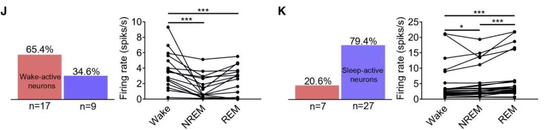 为了研究不同睡眠状态下VLPO神经元的放电情况,在LC-NA神经元特异性表达ChR2病毒小鼠的VLPO脑区植入光电极来记录神经元的放电(图 3A)。激活VLPO脑区的NAergic纤维时,发现VLPO神经元对光刺激有三种不同的反应(图3B,C)。检测这些不同反应的神经元在睡眠-觉醒周期中的放电变化,发现大多数被激光刺激兴奋的神经元(65.4%)在觉醒期间表现出更高的活性,被称为觉醒活跃神经元(wake-active neurons)(图3J),而被抑制的大部分神经元(79.4%)在睡眠期间更活跃被称为睡眠活跃神经元(sleep-avtive neurons)(图3K),不响应光的神经元的放电在不同睡眠-觉醒状态下没有明显的趋向性。以上的研究结果提示,NAergicLC-VLPO通路可以通过激活VLPO脑区的觉醒活跃神经元和抑制睡眠活跃神经元产生协同效应来促进觉醒。