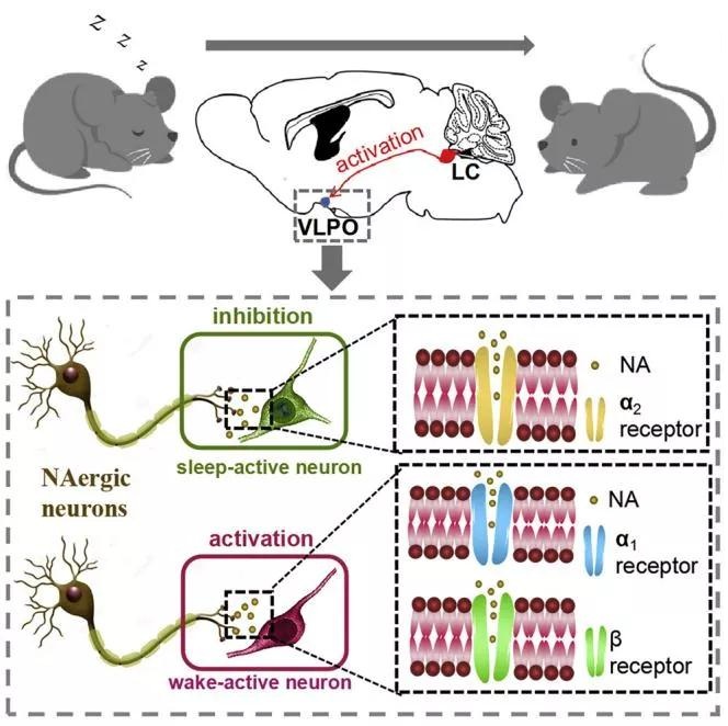 模式图:LC-VLPO的NAergic通路有重要的觉醒促进作用,通过作用于α2受体抑制VLPO脑区的睡眠活跃神经元,和作用于α1受体和β受体激活觉醒活跃神经元来协同完成。