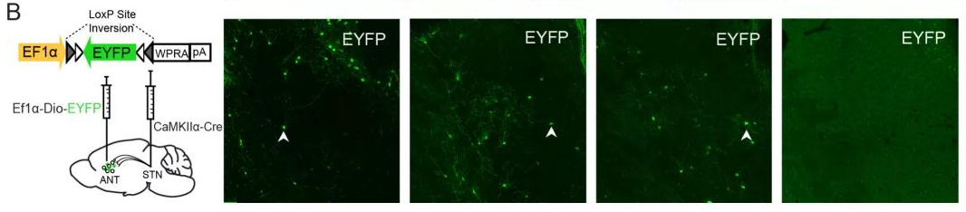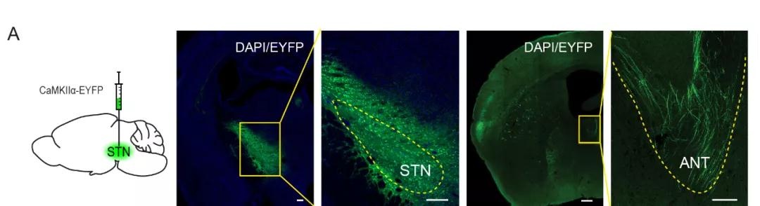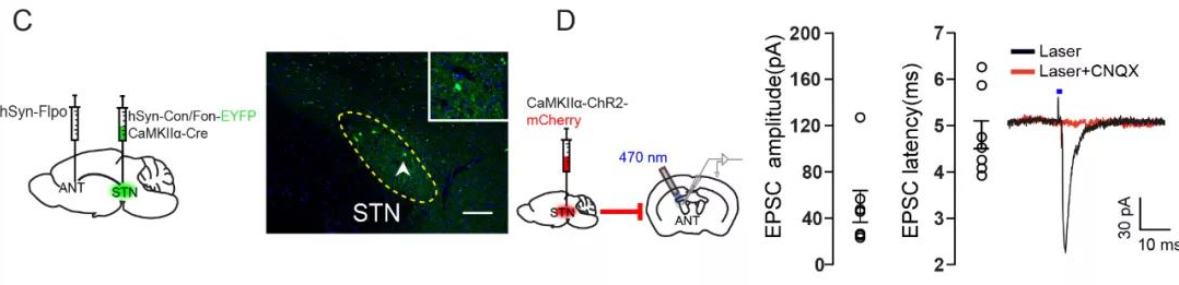 在这篇文章中,作者通过顺行、顺行跨单级突触及逆行病毒示踪系统反复验证ANT是STN尚未被报导的下游核团。进一步利用光遗传学偶联膜片钳技术发现STN与ANT之间存在功能上的兴奋性单突触连接。