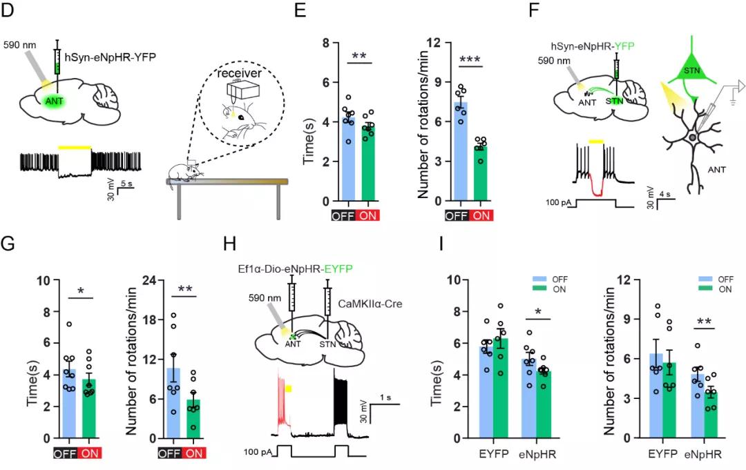 为探究STN-ANT环路在PD模型小鼠运动控制中的作用,作者利用光遗传学技术抑制ANT或STN-ANT环路,结果显示:给予黄光照射后能够改善PD小鼠运动障碍。
