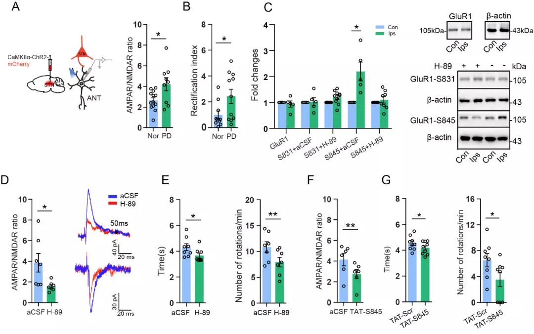 最后,在探究STN-ANT通路导致PD模型小鼠运动障碍的研究中,作者发现PD模型小鼠损伤侧STN-ANT通路中AMPAR/NMDAR电流比值明显增大,即突触强度增加。进一步地,损伤侧AMPAR整流系数增加,提示损伤侧AMPAR中GluR1亚基在膜上表达增加[3]。Western blot结果亦证实,损伤侧ANT神经元内S845位点磷酸化的GluR1(GluR1-S845)显著增加。通过PKA抑制剂或TAT-S845阻断GluR1-S845磷酸化,纠正STN-ANT通路异常增强的突触连接,可以改善PD小鼠运动障碍。