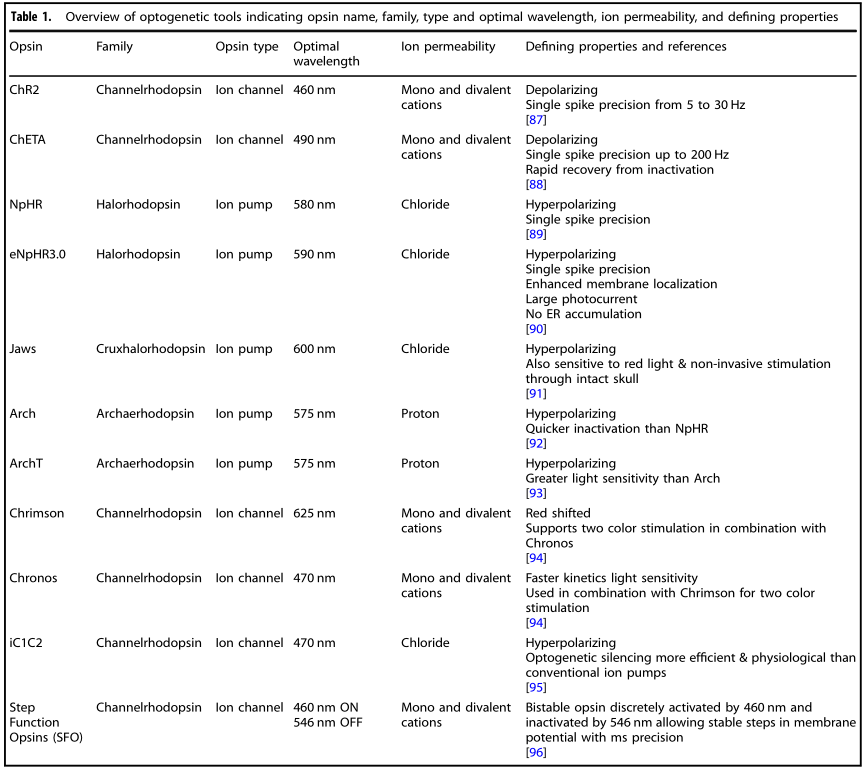 表1. 光遗传学工具概览(包含视蛋白名称、家族、类型和最佳波长等)