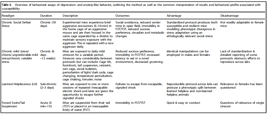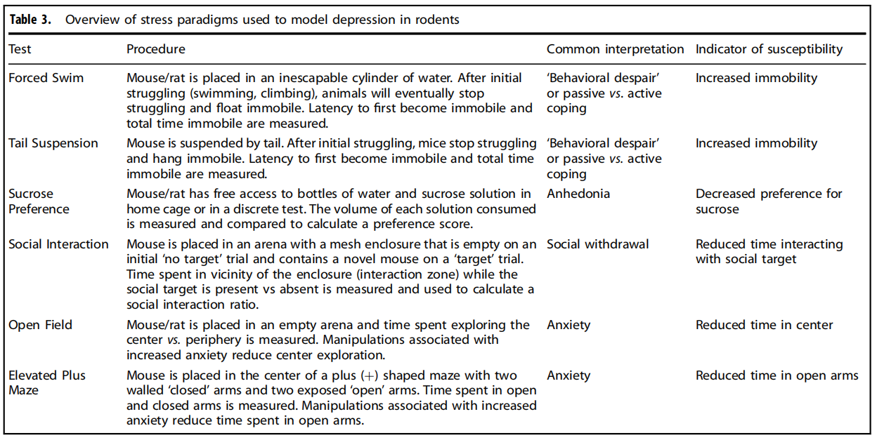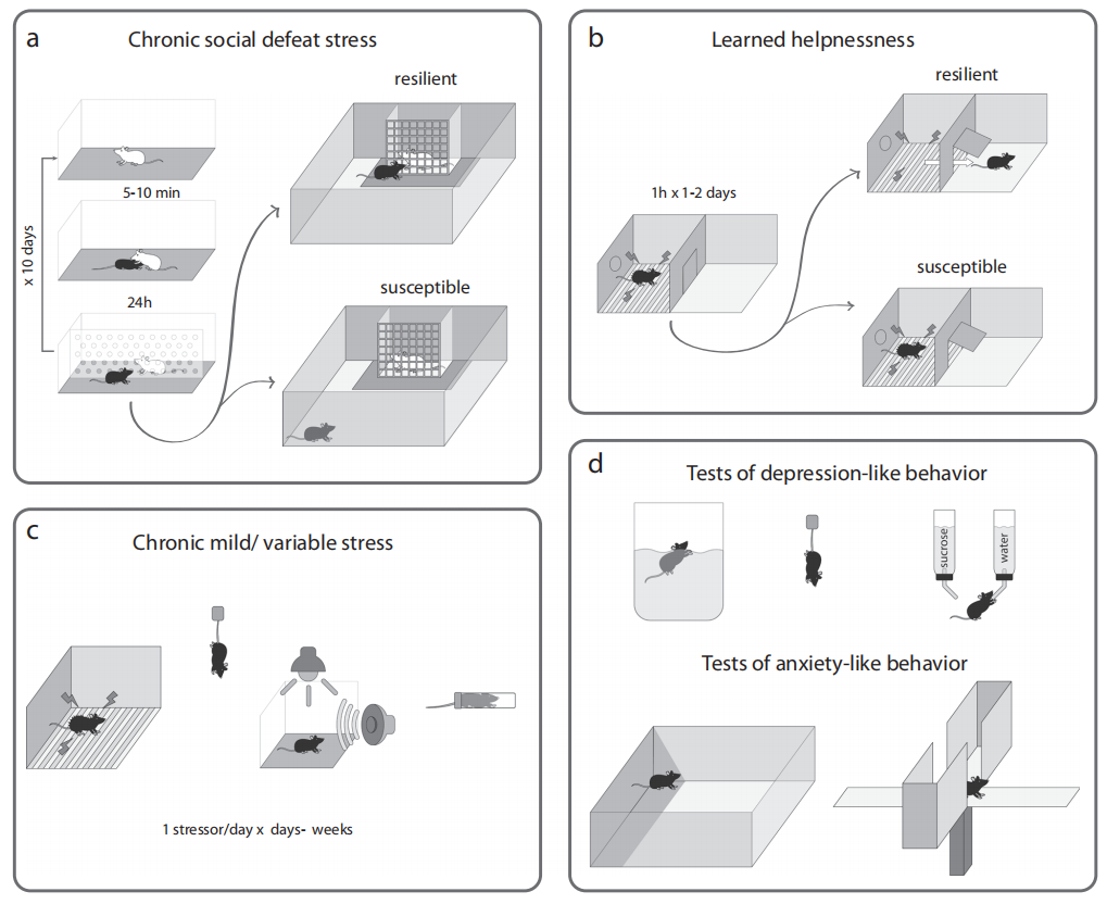 基于压力应激和抑郁症之间明确的相关性,大多数动物可以通过慢性应激或急性应激来诱导抑郁样行为。抑郁样行为可以通过一系列的行为学表型进行评估,如糖水偏好实验、悬尾实验(TST)和强迫游泳实验(FST)。这些行为学可以从某一方面反映抑郁症的核心特征,因此广泛运用于行为表现和抑郁症之间的研究中。常见的慢性应激抑郁模型有:慢性社会挫败应激模型(CSDS)、慢性温和应激模型(CMS)、慢性不可预知应激模型(CUMS)、慢性可变应激模型(CVS)、习得性无助模型(LH)。而急性应激的动物模型有:强迫游泳、悬尾实验和急性束缚应激(ARS)。在光遗传学和化学遗传学的研究中,研究人员偏好于使用CSDS、CMS和CVS模型进行神经环路相关的研究。