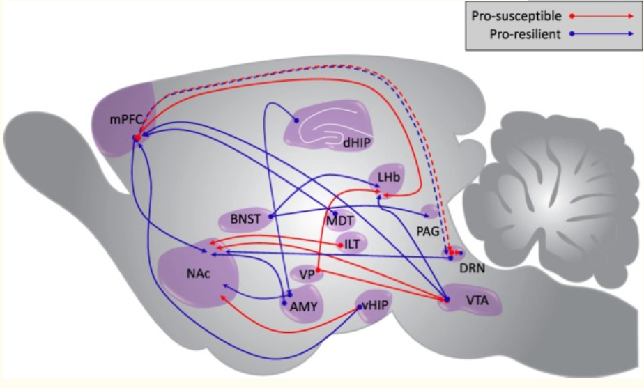 在抑郁症患者和啮齿动物抑郁症模型的PFC中都可以观察到神经元活性降低。光遗传学激活mPFC(前额叶皮层内侧区)神经元可以逆转社会挫败小鼠的抑郁样行为,如社交回避和快感缺乏。这可能是由mPFC投射到NAc的神经元所介导,化学遗传学定向激活mPFC-NAc的投射增加了抑郁小鼠的社交互动。在习得性无助抑郁模型中,对mPFC中表达小清蛋白(PV)阳性的GABA神经元进行研究,发现压力事件会降低mPFC的PV中间神经元兴奋性突触活性。化学遗传学抑制PV中间神经元促进了习得性无助行为,增加小鼠的逃避潜伏期和失败次数。此外化学遗传学激活vmPFC(腹内侧前额叶皮层)-DRN(中缝背核)的投射可兴奋DRN的GABA能神经元,从而抑制DRN中的5-HT(5-羟色胺)能神经元,促进习得性无助行为。