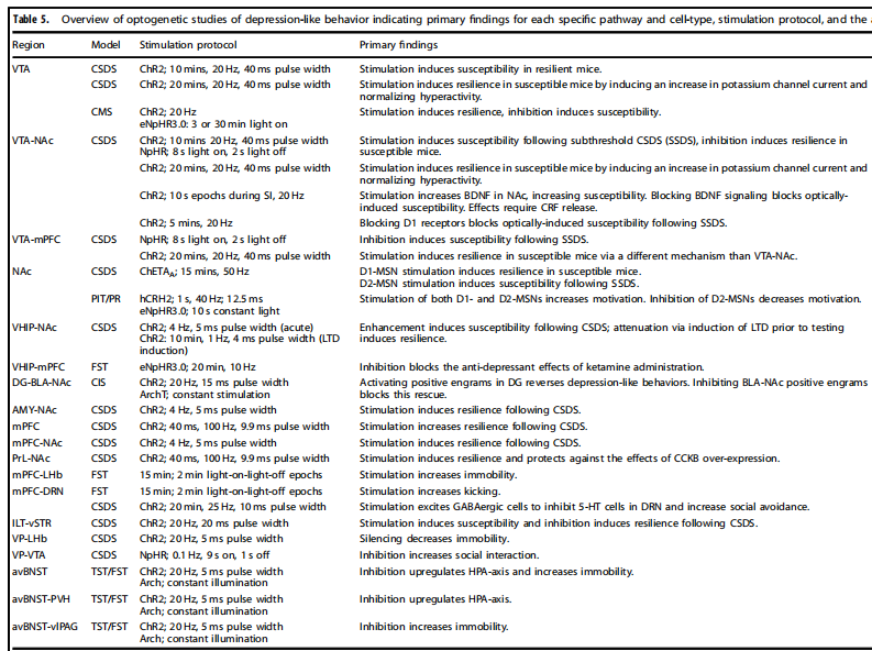 表5. 抑郁样行为的光遗传学研究概述(部分)