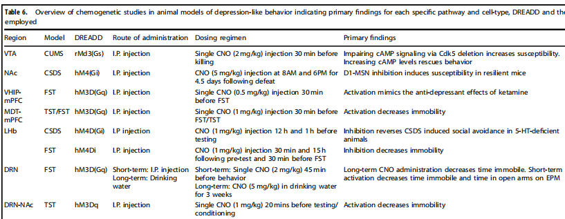 表6. 抑郁样行为动物模型的化学遗传学研究概述(部分)