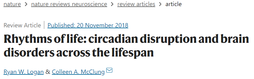 在人体中,24小时的昼夜节律震荡几乎存在于每一个器官和每一类细胞中。生物钟系统通过同步化调节身体不同部位的生物钟,使机体适应环境的变化。正常情况下,环境的光线会激活视网膜特化感光神经节细胞(ipRGCs),ipRGC通过视网膜-下丘脑通路投射到下丘脑的视交叉上核(SCN)。下丘脑的视交叉上核(SCN)是昼夜节律震荡的起搏器,能调节神经元活性、体温和激素信号。小编在这里给大家推荐Logan RW和 McClung CA发表在《Nature reviews. Neuroscience》题为“Rhythms of life: circadian disruption and brain disorders across the lifespan”的综述文章中,作者介绍了人类生命周期中的昼夜节律的变化,并论述了不同生命阶段的昼夜节律紊乱与这些生命阶段常见的大脑疾病的相关性,并探讨通过把握节律的规律,对脑疾病进行治疗和干预的可行性。