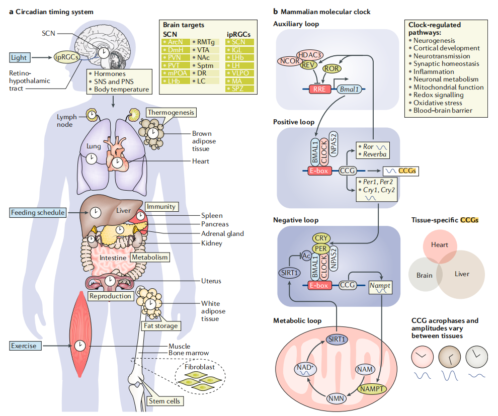 在细胞中,分子的节律是由转录和翻译反馈环路调节,这些反馈调节环路以接近24小时的周期振荡。正反馈环路是节律基因CLOCK、NPAS2、BMAL1在细胞核内的异二聚化所驱动,可调节时钟控制基因(CCGs)的转录,编码周期蛋白(PER)和隐色素(CRY)。在昼夜节律中,PER和CRY蛋白在细胞质中积累,通过二聚体并转位到细胞核以抑制其自身转录,从而关闭反馈环路。