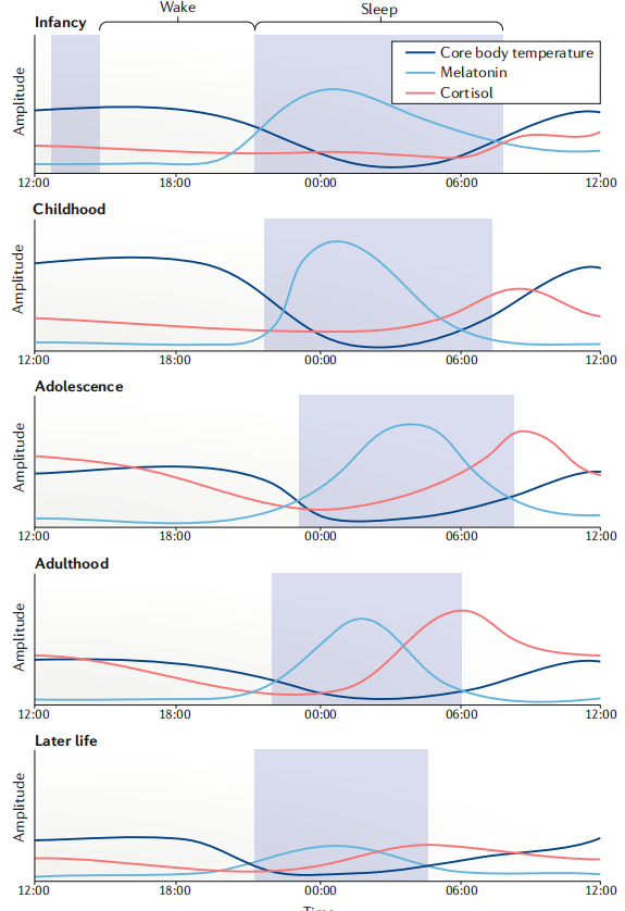 图2. 生命不同时期核心体温、褪黑素和皮质醇的生物节律