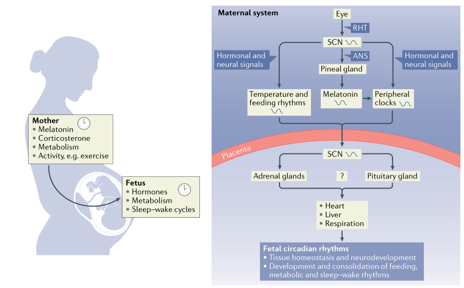 对昼夜节律系统研究和总结,大多来自对啮齿动物和非人灵长类动物的研究。在妊娠中后期,啮齿类动物的SCN的代谢活动和基因表达的节律性明显增加。在人类妊娠的第18周,胎儿的SCN就出现了褪黑素和多巴胺受体,提示褪黑素和多巴胺可能是胎儿昼夜节律信息的主要通信者。母体的褪黑素很容易通过胎盘和胎儿的血脑屏障,这可能是胎儿感知外界昼夜节律的主要途径。