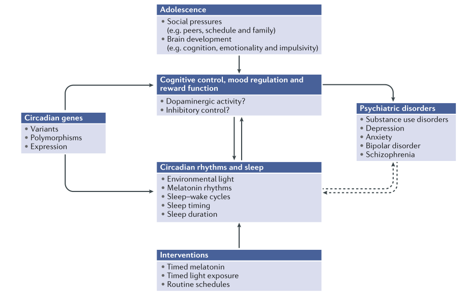 青春期是精神障碍的高度易感期,包括严重的抑郁症、躁郁症和精神分裂症。许多情绪、焦虑和精神障碍的一个主要的原因是睡眠-觉醒周期被打乱。此外,在已经患有精神障碍的个体中,昼夜节律紊乱可能导致情绪和精神病的发生。情绪症状也可能以季节性方式出现,如季节性情感障碍的患者,其症状可能与不同季节光照的数量、持续时间和强度有关。与物质使用障碍类似,青春期和成年期早期的延迟节律与抑郁和情绪症状的严重程度密切相关。最近的研究表明,精神疾病高危的青少年和情绪障碍患者的昼夜节律紊乱预示着更糟糕的预后和症状。