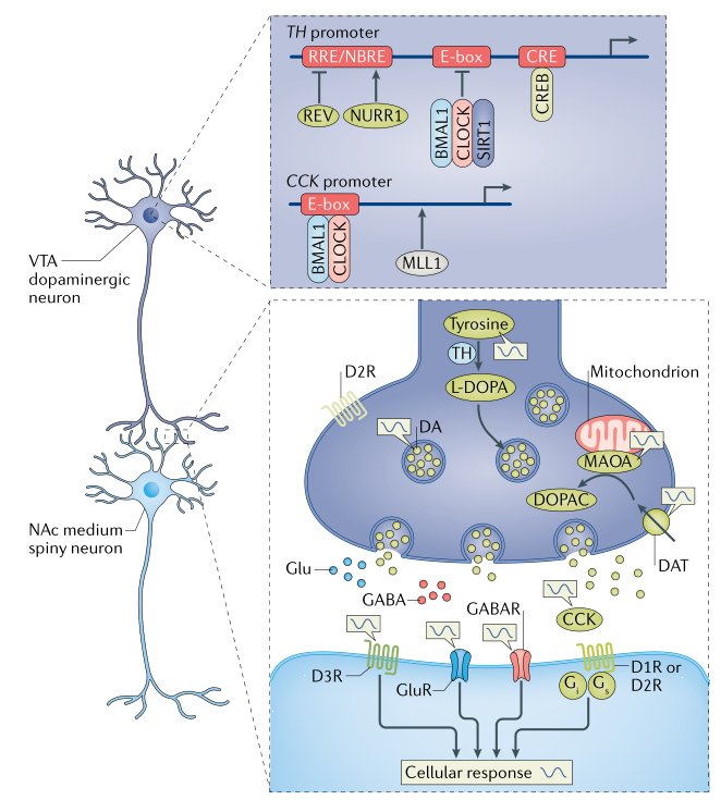 Sirtuin 1(SIRT1)在SCN的表达水平随着年龄的增长而下降,这可能与老年人昼夜节律紊乱相关。啮齿动物大脑特异性敲除SIRT1足以模拟衰老对SCN和昼夜行为影响的表型。而过表达SIRT1则具有保护作用。近期研究显示SIRT1与多巴胺能神经元中编码酪氨酸羟化酶(TH)基因启动子区域的CLOCK结合,以控制TH表达的节律,并最终控制多巴胺合成。