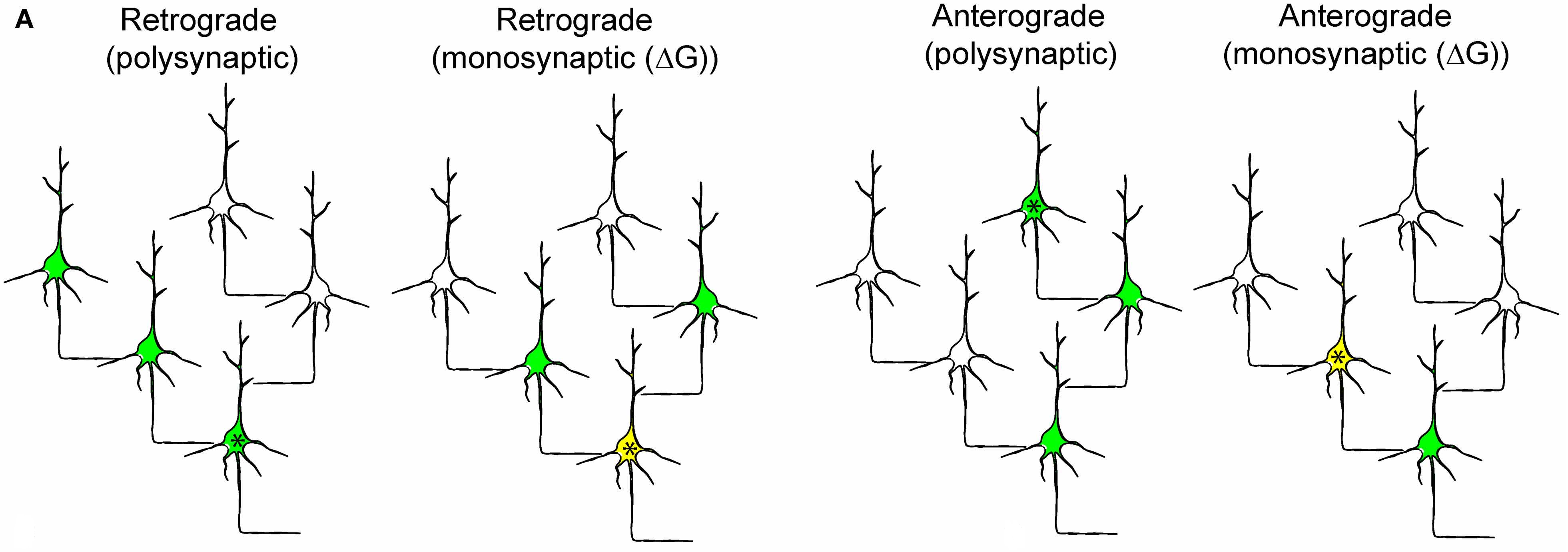 水疱性口炎病毒(Vesicular stomatitis virus,VSV)属于弹状病毒科(Rhabdoviridae)水疱病毒属(Vesiculovirus),是有囊膜的单股负链RNA病毒。用于顺向跨突触示踪的VSV工具病毒,在大/小鼠动物模型中的神经回路示踪研究中广泛使用。它也能感染多种动物模型,包括鱼类、禽类,及非人灵长类等。其特点是复制及跨突触速度快,外源基因表达量超高,可获得神经元精细形态。VSV病毒具有特异顺向跨突触的特性。当病毒定位注射到实验区域,病毒感染神经细胞后在神经细胞内复制并表达携带的荧光蛋白基因,子代病毒产生后经轴突运输到突触前,跨突触进入下游神经元,并开始新一轮的复制、包装及跨突触传播等过程。