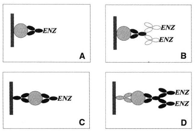 ELISA是酶联接免疫吸附剂测定( Enzyme-Linked Immunosorbnent Assay )的简称。它是继免疫荧光和放射免疫技术之后发展起来的一种免疫酶技术。该技术以免疫学反应为基础,通过将已知的抗原或抗体吸附在固相载体表面,使酶标记的抗原抗体反应在固相表面进行。ELISA技术将抗原、抗体的特异性反应与酶对底物的高效催化作用相结合,具有快速、灵敏、简便、载体易于标准化等优点。在实际应用中,通过不同的设计,具体的方法步骤可有多种, 常见的有直接法(A)、间接法(B)、双抗体夹心法(sandwitich,C)以及间接夹心法(D)等。比较常用的是ELISA双抗体夹心法及ELISA间接法。