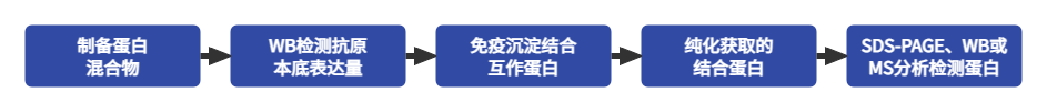 免疫沉淀(Immunoprecipitation,IP)最早作为传统亲和柱色谱的改进方法而开发,是用于抗原检测和纯化的最广泛使用的方法之一。IP的原理非常简单:针对特定靶蛋白的抗体(单克隆或多克隆)与样品中的该靶标(例如细胞裂解液)形成免疫复合物。然后将免疫复合物捕获或沉淀在固定有抗体结合蛋白(例如蛋白A或G)的珠状支持物上,然后将未沉淀在珠子上的其他蛋白洗掉。最后,将免疫复合物从支持物上洗脱下来,并通过十二烷基硫酸钠-聚丙烯酰胺凝胶电泳(SDS-PAGE)进行分析,并常通过蛋白质印迹分析(Western blot)检测以验证抗原。