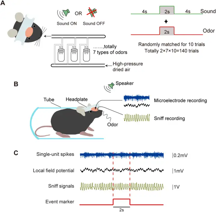 以往对于多感官整合的研究主要集中在视觉和听觉信息的整合,但来自鼻(嗅觉)和耳朵(听觉)的信息整合对哺乳动物也是非常重要的,而相关研究却很少。一些脑区具有整合嗅觉和听觉信息的能力,包括嗅觉和听觉系统中的亚区。既往研究麻醉后啮齿动物的嗅觉系统发现,嗅结节(OT)和梨状皮层(PC)对纯音刺激有反应,但这种声音刺激不会引起嗅球(OB)中的动作电位。当清醒大鼠行为学训练后学会区分单感官(气味或声音)和多感官刺激时,OB和PC中声音会造成局部场电位(local field potentials,LFPs)功率变化。然而,是否有其他重要的脑区也具备整合嗅觉和听觉信息的能力,在很大程度上仍然未知。