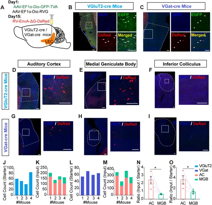 研究人员首先将逆行示踪病毒AAV-retro-hSyn-mCherry注射到C57BL/6J小鼠LEC,两周后检测发现红色荧光mCherry表达于AC和MGB。这表明LEC接收来自AC和MGB的直接投射。作者进一步使用狂犬病毒介导的逆行跨单突触示踪系统,将病毒分别注射到VGluT2-Cre和VGat-Cre小鼠的LEC中,结果显示,在LEC中可观察到起始细胞(共表达TVA-GFP和EnvA-DsRed,黄色),在AC和MGB中检测到输入神经元(RV标记,仅表达EnvA-DsRed,红色)。进一步分析表明,在VGluT2-Cre和VGat-Cre小鼠中,LEC从AC接收的输入比从MGB接收的输入更多。总的来说,这些结果表明,LEC的兴奋性谷氨酸能神经元和抑制性GABA能神经元均接收来自AC和MGB的直接投射,且来自AC的输入比来自MGB的输入更多。