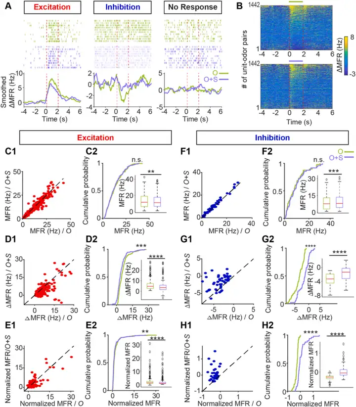 研究人员通过分析气味-声音对的单单位反应探究声音的存在是否会影响嗅觉中枢的气味表征,在OB M/Ts中比较了气味-声音关闭(O)和气味-声音打开(O+S)试验的放电速率。结果显示,对于兴奋性和抑制性反应,纯音和气味同时出现会显著影响气味诱发反应(声音刺激降低了气味诱发的兴奋性和抑制性反应)。接下来,作者对LEC神经元进行了类似的分析。首先发现气味单独刺激或高频音调+气味刺激会引发LEC神经元兴奋性和抑制性反应。研究人员总共记录了细胞-气味对的1442个单单位,其中244个是兴奋性的,48个是抑制性的,剩余的则对上述任何一种刺激都没有反应。随后,研究人员评估声音对LEC神经元气味诱发反应的影响,结果表明声音的存在显著降低了LEC中气味诱发的放电速率,也就是说,声音可以调节这些嗅觉脑区的气味表征。