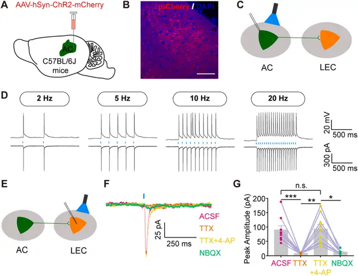 上述研究发现LEC从AC接收很多输入,而这些输入的功能尚不清楚。因此,研究人员进一步探索AC脑区神经元是否以及如何调节LEC锥体神经元的活性。通过光遗传学技术特异性激活小鼠AC脑区神经元,在LEC给予单脉冲光刺激,使用离体脑片膜片钳技术在LEC锥体神经元中记录到稳定的光诱导突触后电流。由于皮层区域的投射细胞通常是锥体神经元,作者推测AC到LEC的输入是谷氨酸能输入。为确定AC神经元是否通过直接突触连接调节LEC锥体神经元,记录河.豚毒素(TTX,钠离子通道阻断剂)和4-AP(4-氨.基吡啶,非选择性的钾离子通道阻断剂)存在情况下的光诱导突触后电流。结果显示光诱导的突触后电流被TTX完全阻断,并被4-AP恢复,表明AC和LEC神经元之间有直接突触连接。进一步研究这种输入的性质,应用NBQX(AMPA受体拮抗剂)后,光诱导的突触后电流显著减少,表明LEC锥体神经元接收来自AC的兴奋性输入。综合来看,这些结果表明AC神经元与LEC锥体神经元形成兴奋性单突触连接。