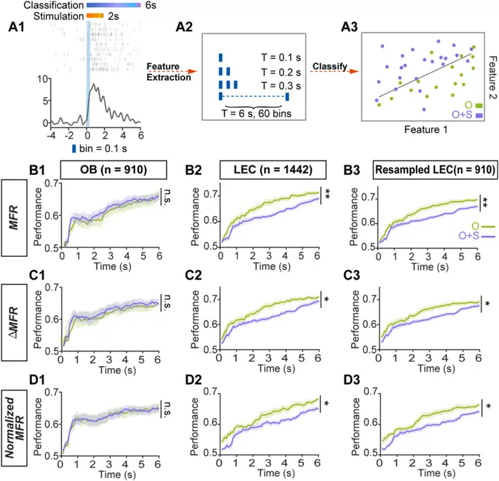 为研究声音刺激是否影响OB和LEC中气味信息的神经解码,研究人员评估了在存在气味-声音双重刺激或不存在声音刺激、仅有气味刺激这两种情况下,细胞区分气味的能力。通过逻辑回归(LR)、支持向量机(SVM)及二分类模型分析细胞的气味分类准确性。对所有记录细胞的Logistic回归分析表明,声音刺激对OB的气味解码能力没有影响,但显著降低了LEC的气味解码能力。