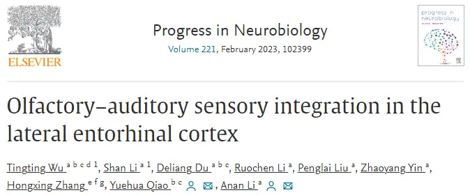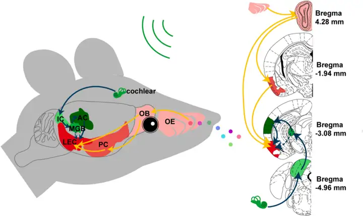 外侧内嗅皮层(LEC)是一个高级的嗅觉皮层区域,在嗅觉感知和嗅觉记忆中发挥着不可或缺的作用。据报道,LEC不仅与海马、嗅周皮层及情绪相关区域如杏仁核和腹侧纹状体密切相关,与OB和PC也有相互联系。事实上,嗅觉亚区的传入纤维是LEC的主要输入,其轴突末梢与LEC II/III层锥体细胞和扇形细胞的顶端树突相连;研究显示,LEC接收来自听觉系统的输入;这些结构连接可能具有功能效应。因此,LEC很可能是嗅觉-听觉多感官整合的关键脑区。然而,现有的研究并没有提供直接证据来支持这一假设。