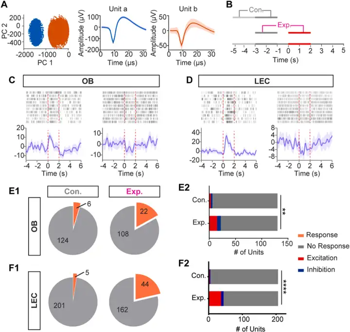 为检验这些假设,在清醒头部固定小鼠的OB和LEC中进行了多通道在体电生理记录。实验中,在隔音房间里给予小鼠随机配对的嗅觉和听觉刺激。刺激系统的一个信号控制气味的输送,另一个信号产生声音。气味被输送到小鼠鼻前1 cm处;听觉刺激通过开放式扬声器呈现,为28 kHz纯音(具有ON或OFF两种状态),经验证的声音刺激强度为80 dB±5 dB。扬声器位于小鼠前外侧(30◦)约25厘米处。七种气味类型为乙酸异戊.酯-香蕉香味、苯甲醛-似苦杏仁味、2-庚.酮-类似梨的水果香味、正庚.酸-脂肪样气味、正戊.醇(特殊气味)、2-戊.酮(特殊气味)和干燥空气。七种气味类型和两种声音类型(ON或OFF)以随机和平衡的次序配对。刺激时间为2 s,刺激间隔(ISI)为10 s,每种气味和声音的组合重复10次,每只小鼠经历140次试验。既往研究显示低频刺激(2.8 kHz)不能引起OB中的反应,并且超声波发声在啮齿类动物交流中很重要,于是,研究人员选择了高频音调(28 kHz)用于多感官整合研究。