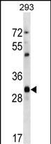 Mouse Cdk1 Antibody (C-term) western blot analysis in 293 cell line lysates (35ug/lane).This demonstrates the Cdk1 antibody detected the Cdk1 protein (arrow).