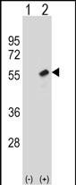 Western blot analysis of RBBP7 (arrow) using rabbit polyclonal RBBP7 Antibody (Center). 293 cell lysates (2 ug/lane) either nontransfected (Lane 1) or transiently transfected (Lane 2) with the RBBP7 gene.