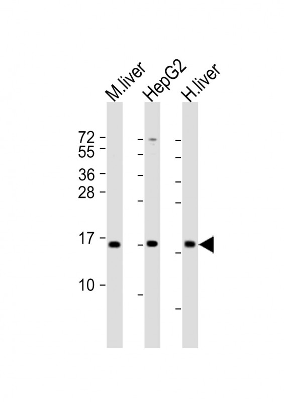 All lanes : Anti-CYB5A Antibody (Center) at 1:2000 dilution Lane 1: mouse liver lysate Lane 2: HepG2 lysate Lane 3: human liver lysate Lysates/proteins at 20 µg per lane. Secondary Goat Anti-Rabbit IgG, (H+L), Peroxidase conjugated at 1/10000 dilution. Predicted band size : 15 kDa Blocking/Dilution buffer: 5% NFDM/TBST.