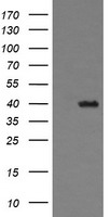 HEK293T cells were transfected with the pCMV6-ENTRY control (Left lane) or pCMV6-ENTRY THUMPD1 (Right lane) cDNA for 48 hrs and lysed. Equivalent amounts of cell lysates (5 ug per lane) were separated by SDS-PAGE and immunoblotted with anti-THUMPD1(Cat# BD-PE3995). Positive lysates (100ug) and (20ug) can be purchased separately from OriGene.