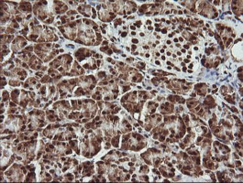 Immunohistochemical staining of paraffin-embedded Human pancreas tissue within the normal limits using anti-THUMPD1 mouse monoclonal antibody. (Heat-induced epitope retrieval by 10mM citric buffer, pH6.0, 120°C for 3min, BD-PE3995)