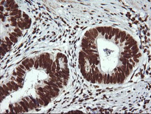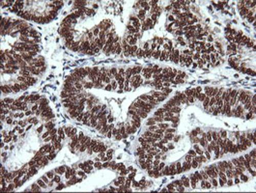 Immunohistochemical staining of paraffin-embedded Adenocarcinoma of Human endometrium tissue using anti-THUMPD1 mouse monoclonal antibody. (Heat-induced epitope retrieval by 10mM citric buffer, pH6.0, 120°C for 3min, BD-PE3995)